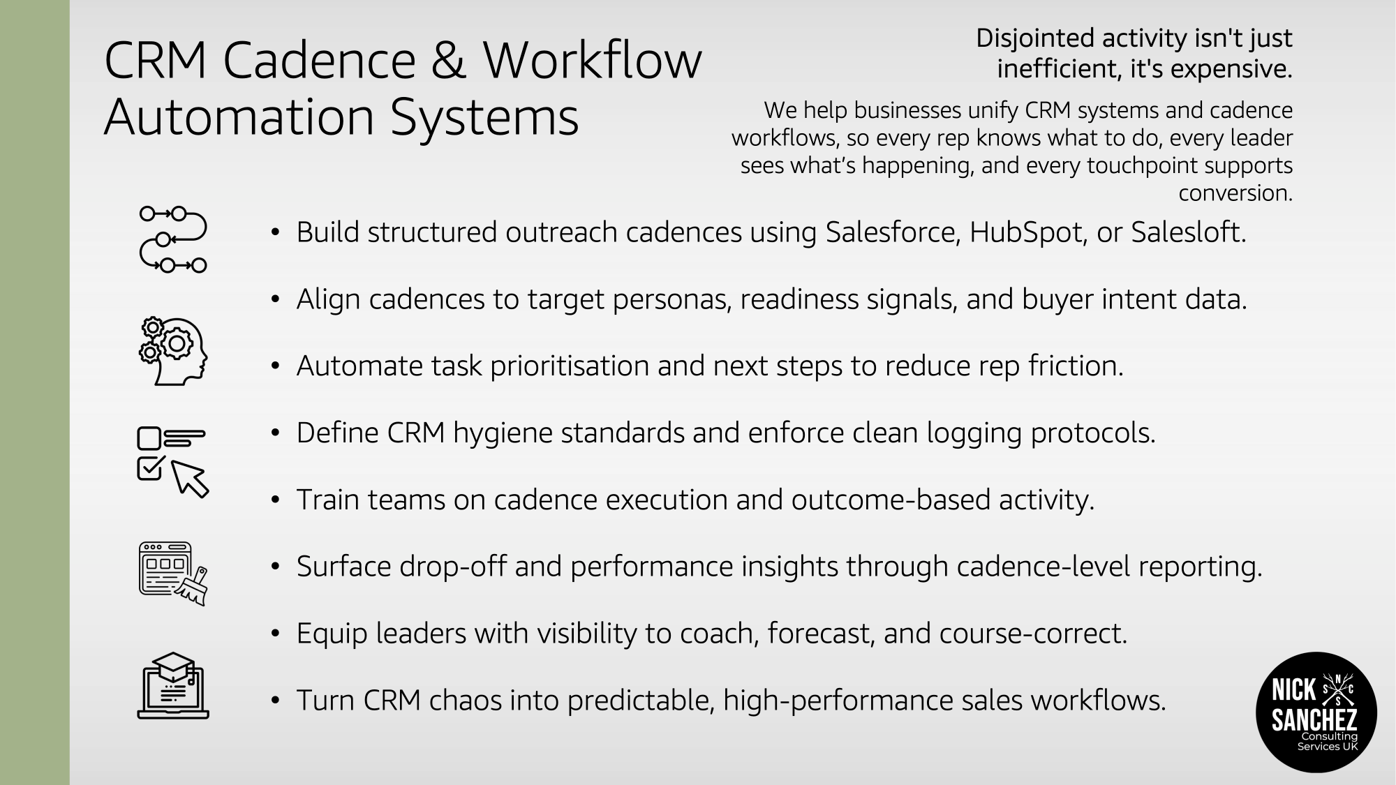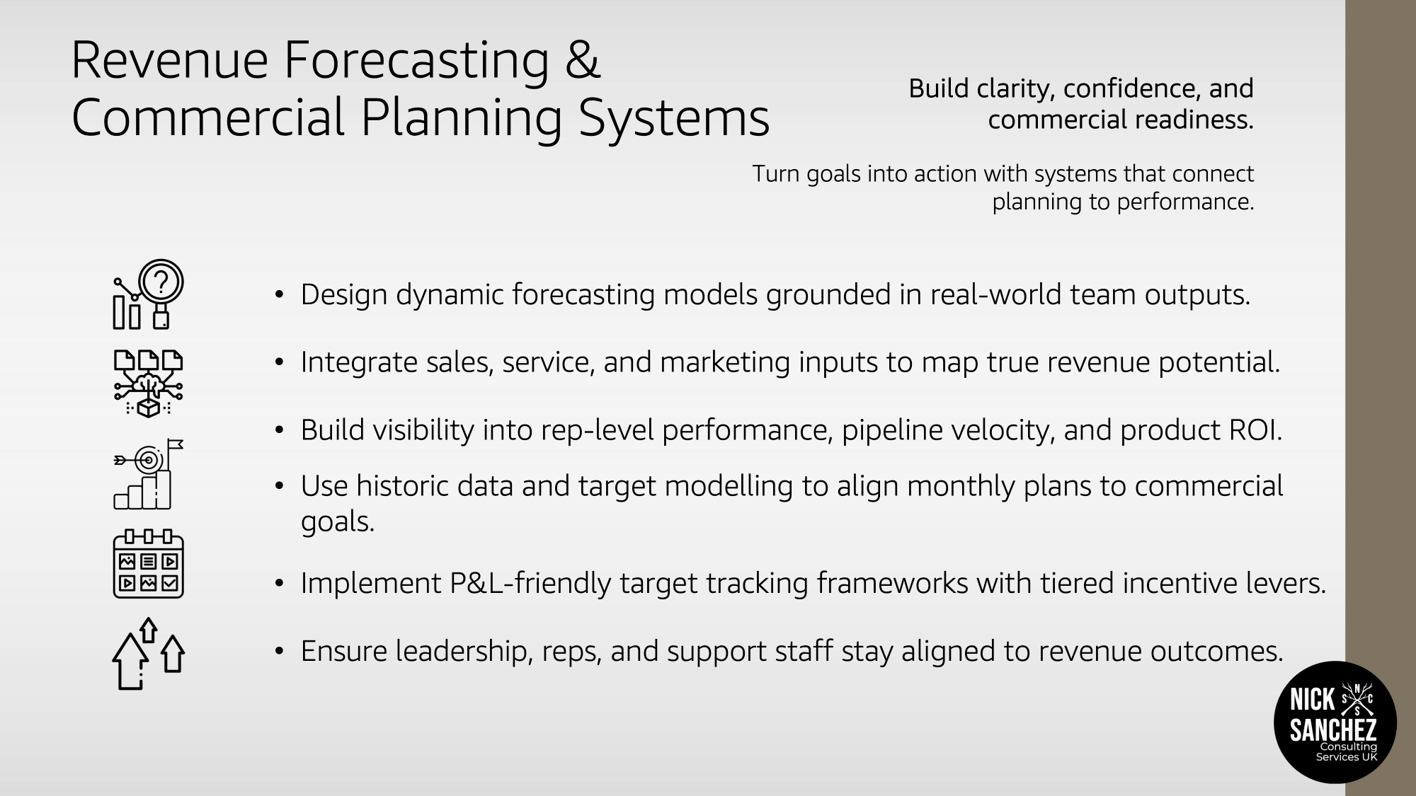 Led by Nick Sanchez, with 20 years of hands-on leadership across sales and operations, we bring structure to the places where revenue gets messy. Whether you're growing a D2C channel or managing a multi-stakeholder pipeline, we help turn ambition into action.
